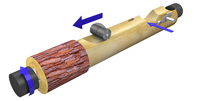Зажим бревна осуществляется с помощью установленных друг на против друга высокоточных центров с гидрозажимом для надежного базирования бревна, исключающими появление вибрации во время обработки, зажимы с легкостью выдерживают значительный вес бревна, такая система наиболее эффективна для тяжелых условиях эксплуатации.