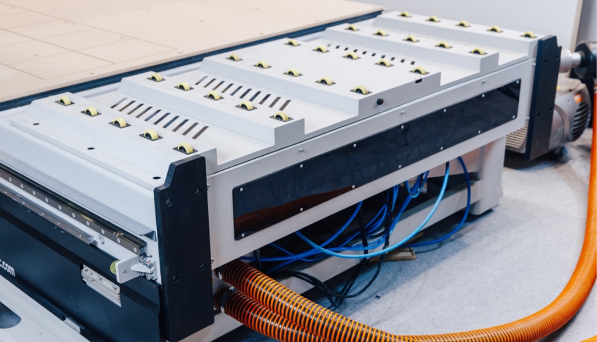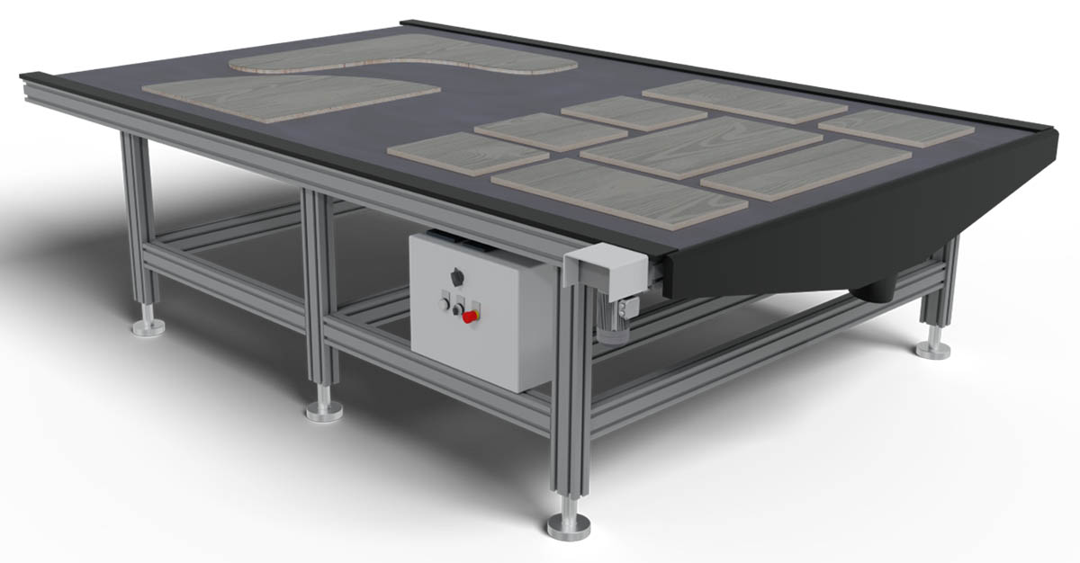 Разгрузка вырезанных деталей происходит автоматически при помощи программного толкателя и автоматического разгрузочного конвейера. Толкатель оснащен встроенной системой аспирации. Поэтому он не только сталкивает заготовки, но и производит очистку рабочего стола от пыли. Разгрузочный конвейер работает автоматически по датчику. Также оснащен дополнительной аспирацией на верху ленты и на входе-выходе в конвейер.
