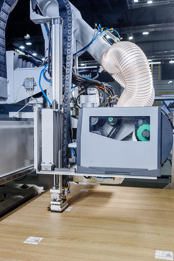 Для автоматизации производства в настоящее время на мебельных предприятиях все чаще применяется штрихкодирование. В данной линии наклейка этикеток производится в автоматическом режиме по программе без участия оператора. Тем самым исключается человеческий фактор - нет возможности наклеить этикетку не на ту деталь. Станок полностью поддерживает программное обеспечение Базис-ЧПУ. Возможен прямой импорт файлов управляющих программ, в том числе и на печать этикеток. Гибкая настройка внешнего вида этикеток и отображаемой на ней информации.