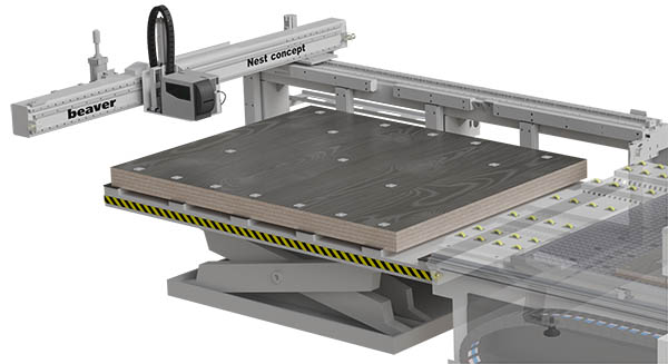 Данная автоматическая производственная линия предназначена для скоростного высококачественного смешанного раскроя полноформатных плитных материалов (ДСП, МДФ) посредством фрезерования с последующей присадкой технологических отверстий по технологии NESTING.