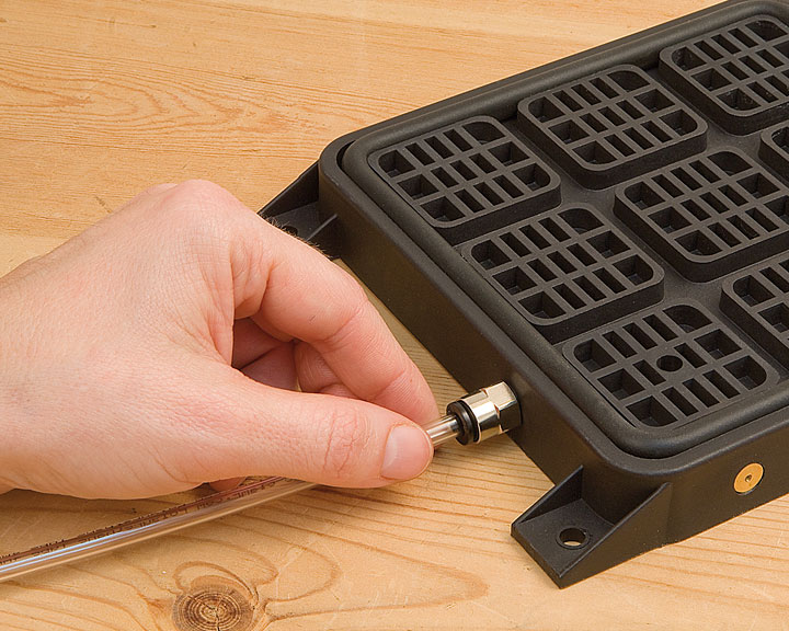 Подача сжатого воздуха осуществляется через соединительную трубку, подключаемую в быстроразъемный соединитель. Распределительный блок позволяет одновременно подключить до пяти пневматических базовых модулей.