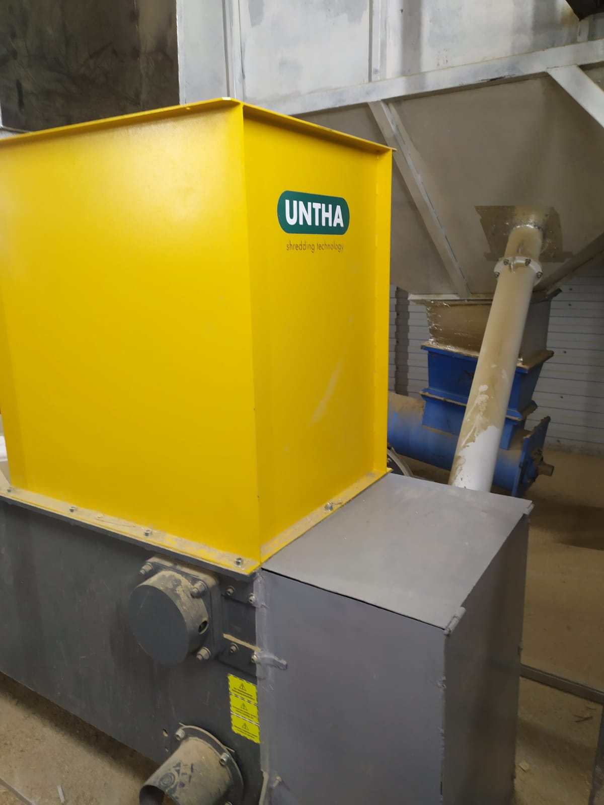 В шредерах-дробилках UNTHA модели LR переработка осуществляется валом со сменными ножами и подвижной плитой, надвигающей материал на вал. Чтобы получить щепу определенного размера используются сменное сито.