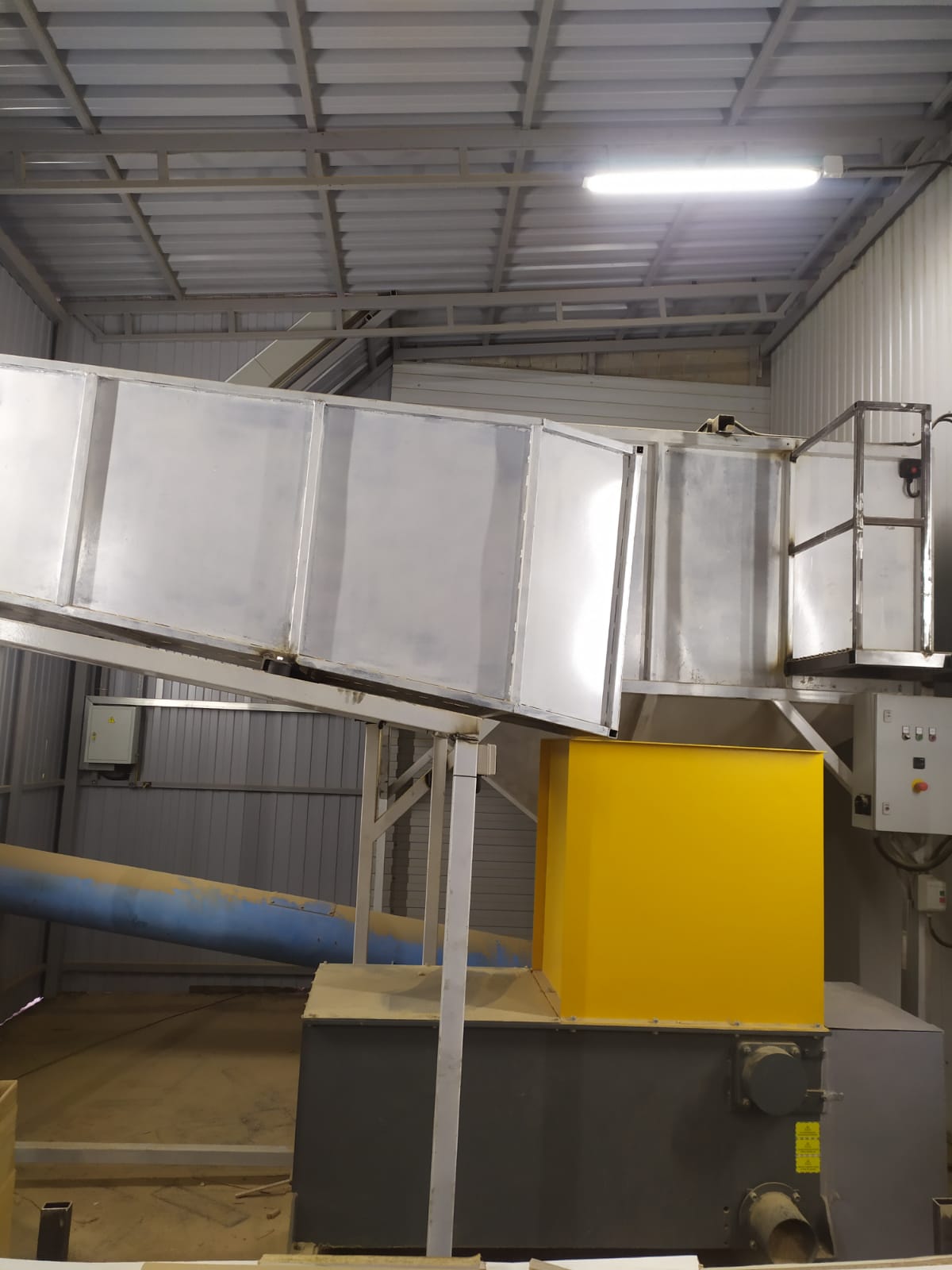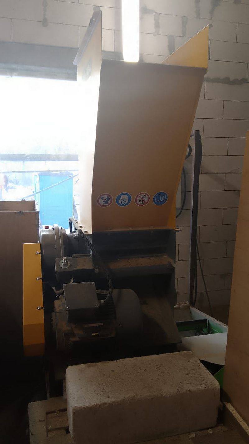 Сырье подается в загрузочный бункер вручную или механически. Далее с помощью гидравлической пресс-плиты происходит прижим к роторному механизму с ножами для измельчения.
