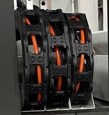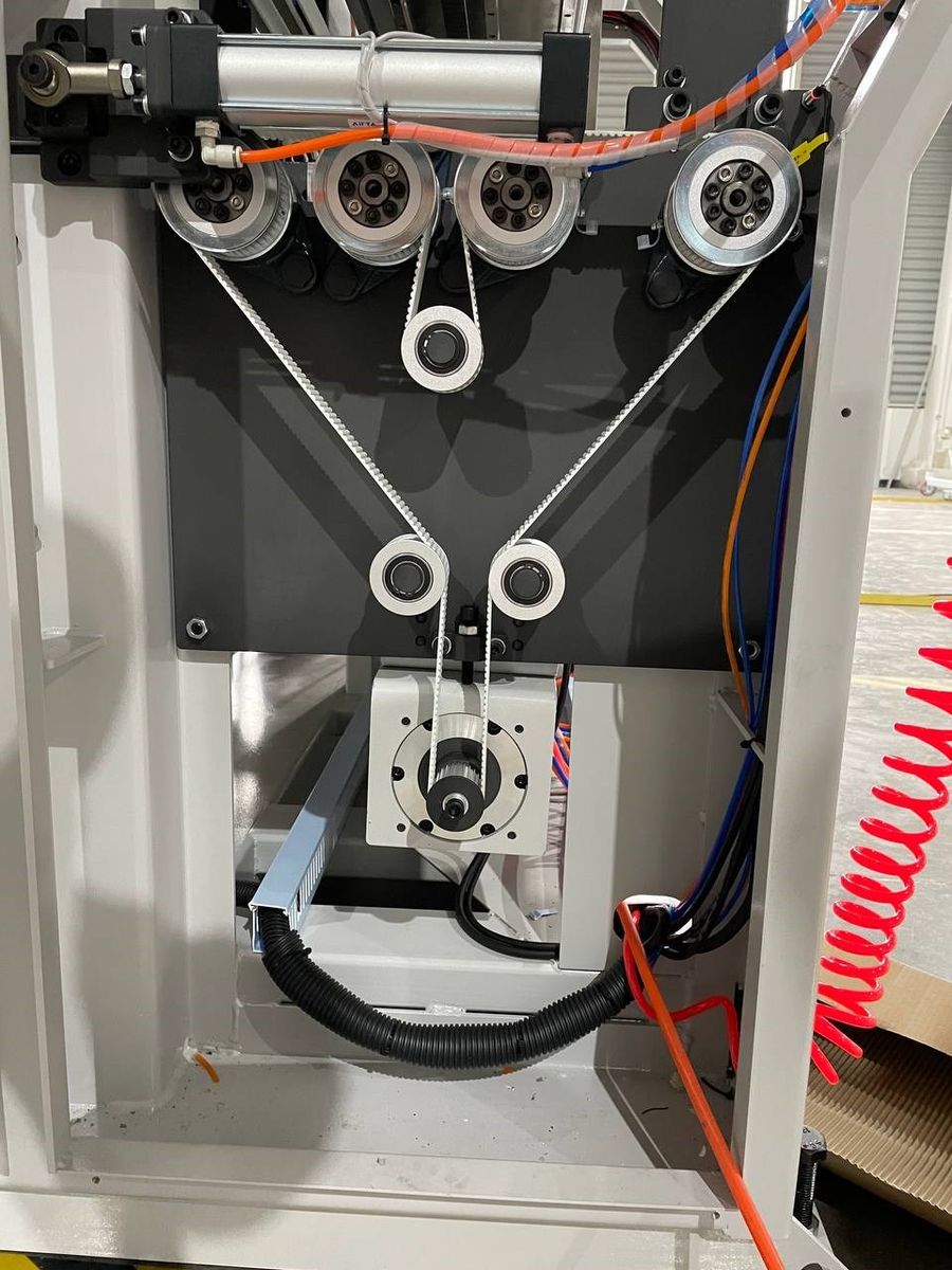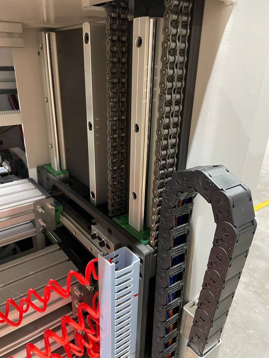 Так как станок работает на больших скоростях очень важно обеспечить защиту силовых кабелей и пневматических магистралей от внешних повреждений связанных с перетиранием и контактом с элементами станины, а также ограничить возможность критических углов изгиба. Завод - изготовитель позаботился об этом установив везде, где есть хотя бы малейшая вероятность повреждения, специальные защитные сверхгибкие кабель-каналы и это гарантированно увеличивает ресурс работы станка и повышает уровень безопасности на производстве.