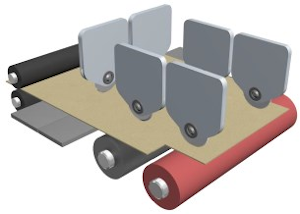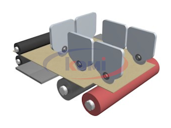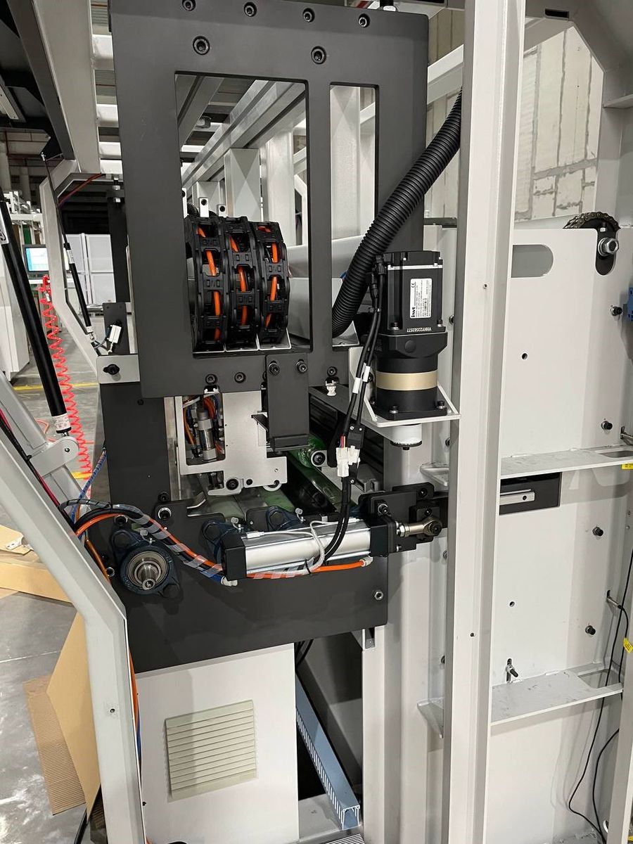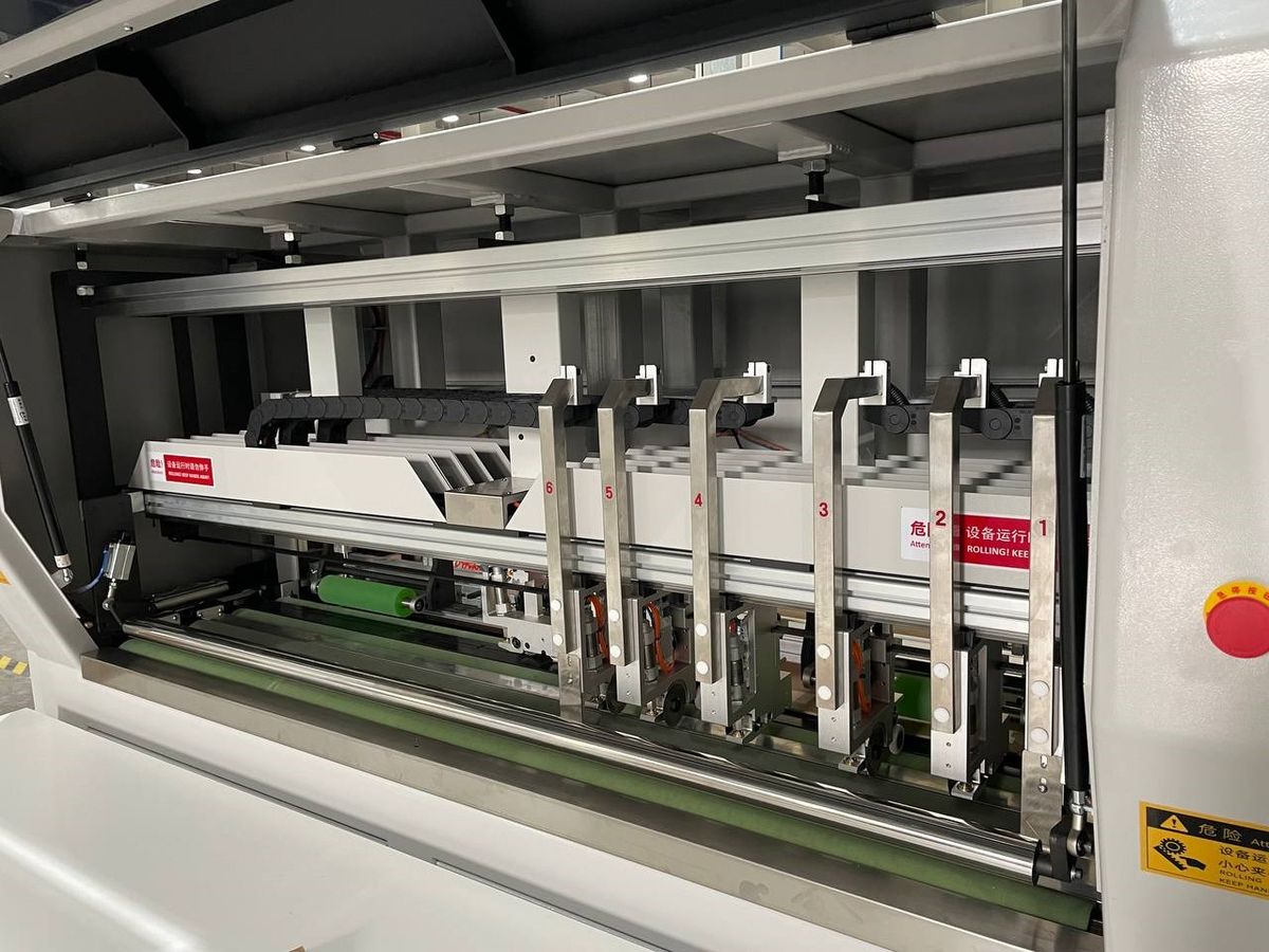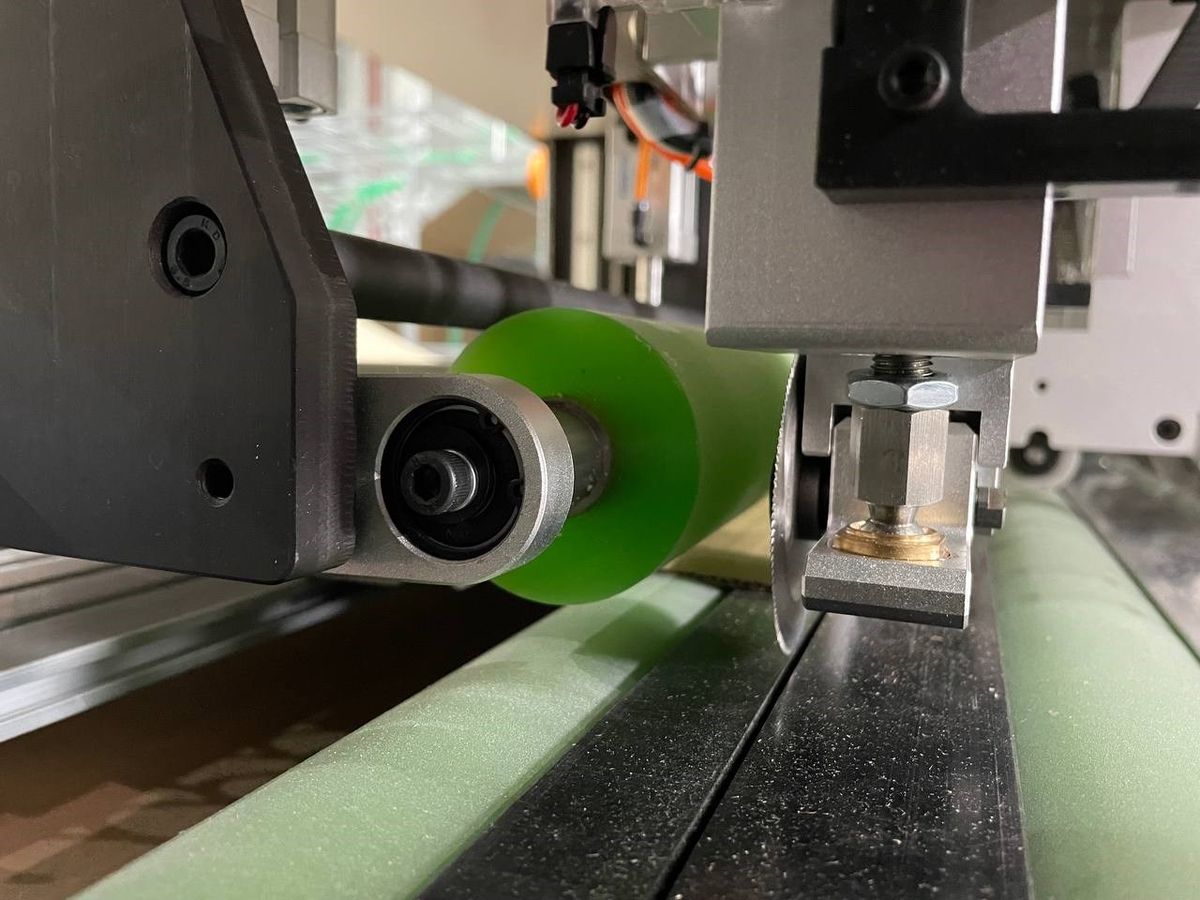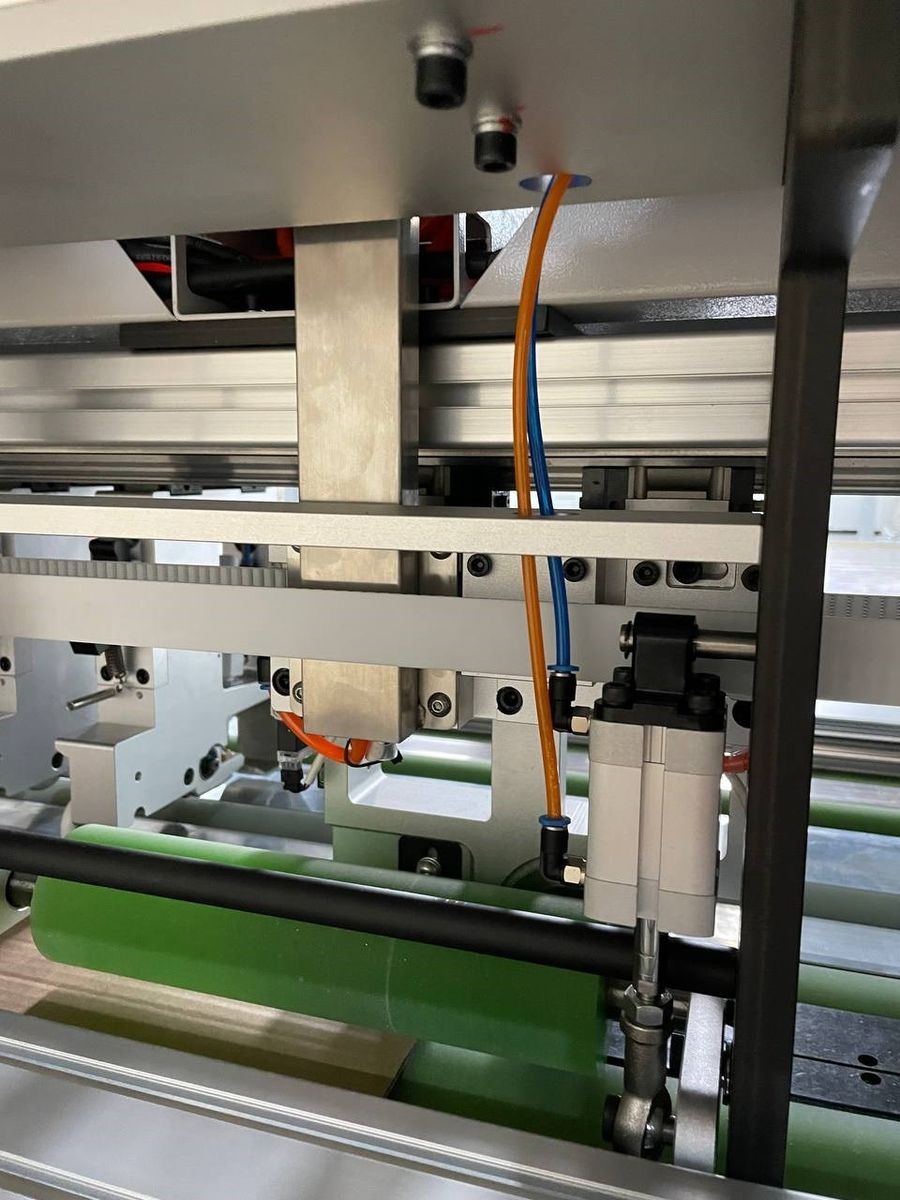 Станок оснащён шестью продольными модулями для рилёвки и резки картона. Данные агрегаты автоматически настраиваются на заданные размеры упаковки и также в автоматическом режиме осуществляют резку или рилёвку за счёт изменения давления в пневмоцилиндрах рабочих головок. Все валы в зоне резания и подачи имеют обрезиненную поверхность, что не допускает проскальзывания и обеспечивает равномерную подачу картона. Также резина на валу, в которую входит нож при раскрое, обеспечивает более качественный рез и гарантирует длительный срок эксплуатации режущего инструмента.