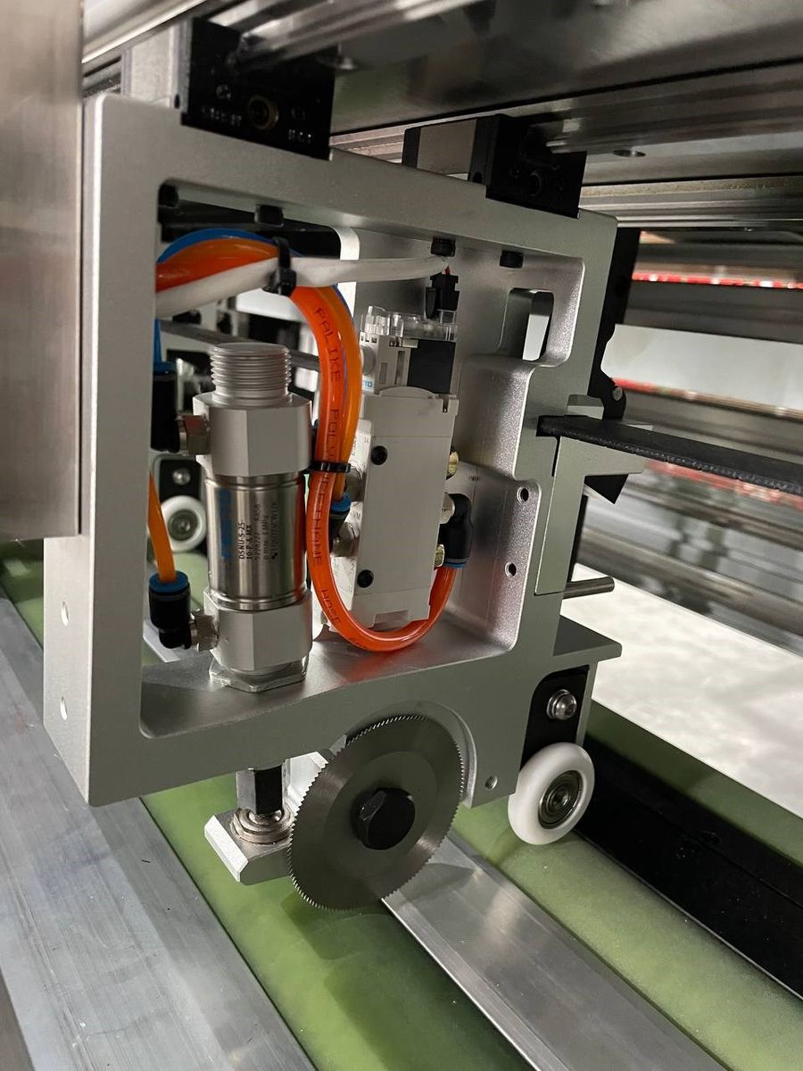 Для поперечной рилёвки и резки на станке используется один модуль на котором установлен пневматический агрегат с круглым зубчатым ножом. Резка или рилёвку осуществляется за счёт изменения давления в пневмоцилиндре рабочей головки. Агрегат перемещается по собственным линейным направляющим посредством ременной передачи.