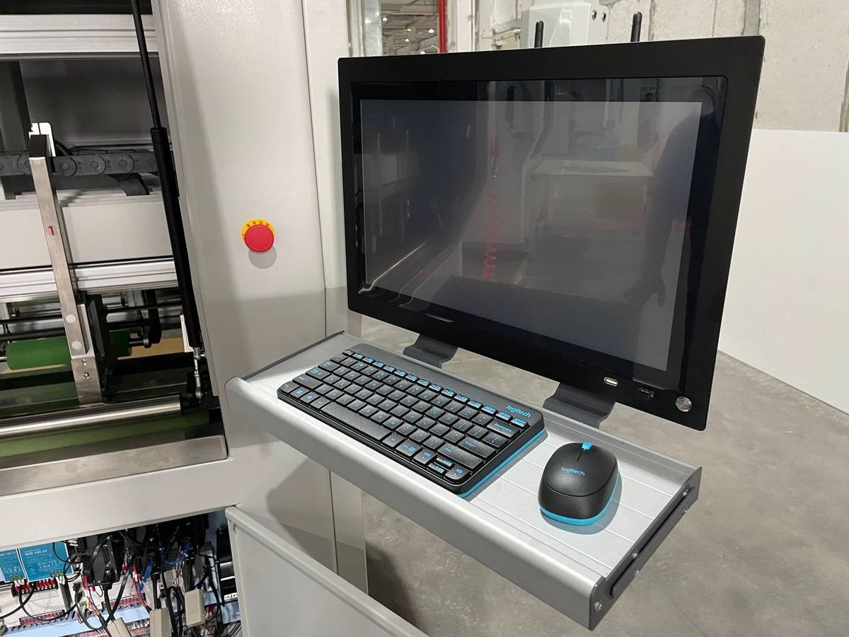 Рабочее место оператора оборудовано эргономичной стойкой на поворотной консоли. На большом мониторе отображается вся необходимая оперативная информация для настройки станка и программирования его работы. С левой стороны от операторского пульта размещена кнопки аварийной остановки, а на удобной полочке перед экраном располагается беспроводная клавиатура и мышь.