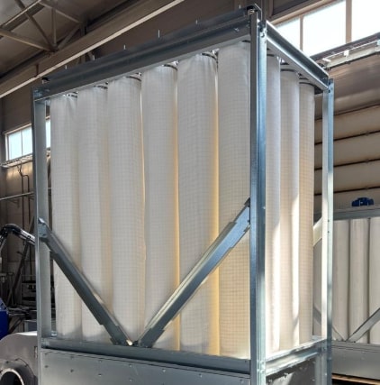 Блок рукавный фильтров из полиэстера. Минимальная фракция улавливаемой пыли до 3 мкм. Плотность фильтровального материала 550 г/м2. Рукавные фильтры установлены в подвижном каркасе.